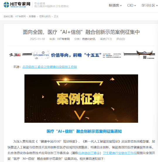 2025年11月10日,北京信息化协会信息技术应用创新工作委员会(简称北京信创工委会)卫生健康行业信创工作组面向全国开展“医疗'AI+信创’融合创新示范案例”征集活动。全国各级医疗机构、信息化厂商和技术单位,无论是基于国产芯片的医疗AI系统,还是基层适用的“AI+信创”轻量化方案,都能参与申报。