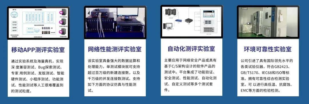 安畅检测(齐鲁物联网测试中心)设有四大核心实验室——移动APP测评实验室、网络性能测评实验室、自动化测评实验室、环境可靠性实验室,确保检测项目的合理工期。