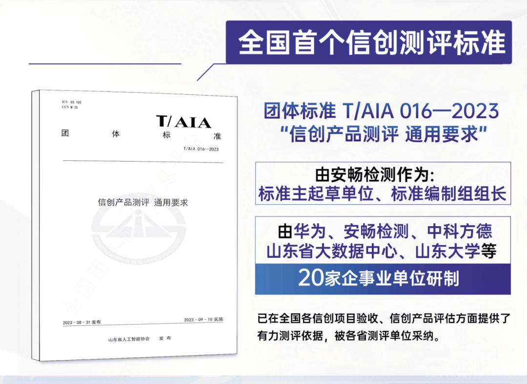 在技术实力方面,安畅检测是“2024年度第四届十大信创机构评选”榜首单位,更在国内率先牵头制定团体标准《信创产品测评 通用要求》T/AIA 016—2023,为行业测评工作提供了权威依据。安畅检测作为主编单位编著的《信创产品测试技术、方法与案例》,为信创产品测试提供了系统、实用的技术参考,是信创领域重要的技术工具书。