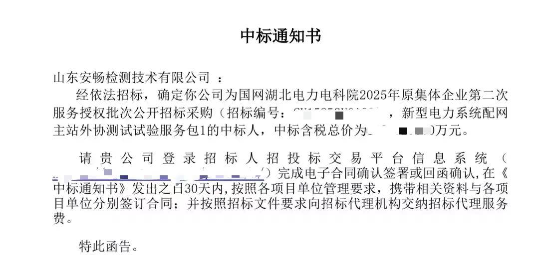 近日,安畅检测从多家投标企业中成功中标国网湖北电力电科院新型电力系统配网主站外协测试试验服务项目。安畅检测此前已多次携手国网开展项目合作,在行业内积累了丰富经验与良好口碑。此次成功中标,是安畅检测在电力系统检测领域技术实力与品牌信誉的又一有力佐证。
