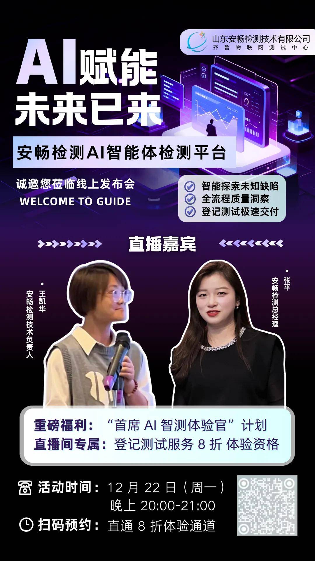 2025年12月22日晚8点,安畅检测总经理张平将携手技术负责人进行AI智能体测评平台发布会专场直播,揭秘AI智能体如何让检测效率提升40%,助企业年底收官!