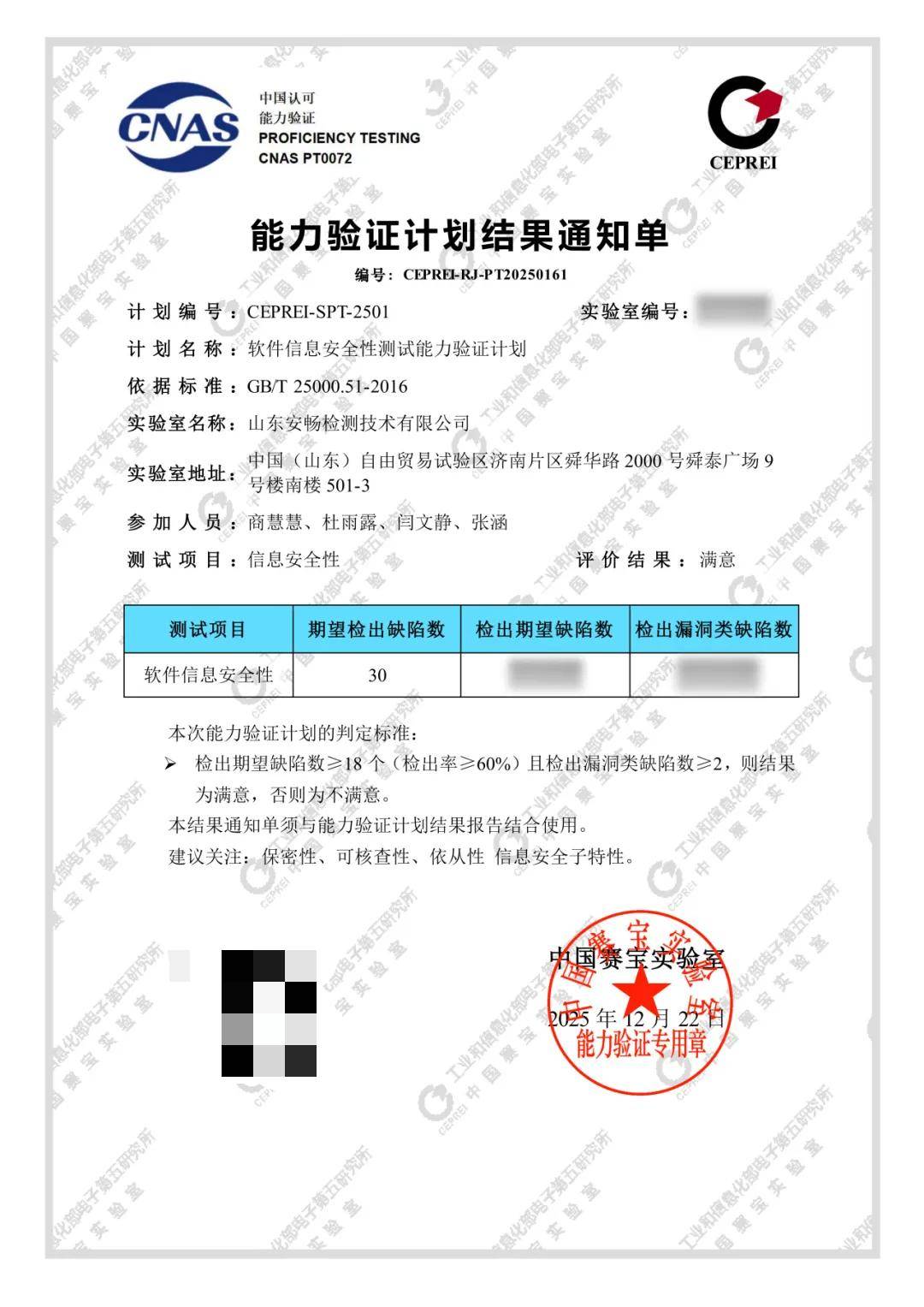 2025年12月22日,安畅检测顺利通过由中国合格评定国家认可委员会(CNAS)授权,中国赛宝实验室(工业和信息化部电子第五研究所、中国电子产品可靠性与环境试验研究所)组织实施的CEPREI-SPT-2501软件信息安全性测试能力验证计划,获得"满意"评价。